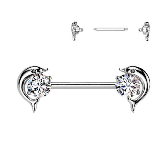 Material Chirurgenstahl 316L mit Gold-PVD- oder Rhodium-Beschichtung Design Delfin-Motiv mit funkelnden Zirkonia-Kristallen Stabstärke / Länge 1,6 mm / 14 mm Verschluss Schraubverschluss Besonderheiten Hypoallergen, langlebig und perfekt für empfindliche Haut Das Brustwarzenpiercing mit Delfin-Motiv und Zirkonia-Kristallen kombiniert ein charmantes Design mit erstklassiger Qualität. Die detailreichen Delfin-Enden sind mit funkelnden...