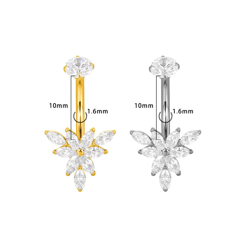 Marquise-förmige Blütenblätter mit klarem Topkristall (5 mm). Innengewinde, wasserfest und kratzfest – für präzisen, sicheren Sitz.