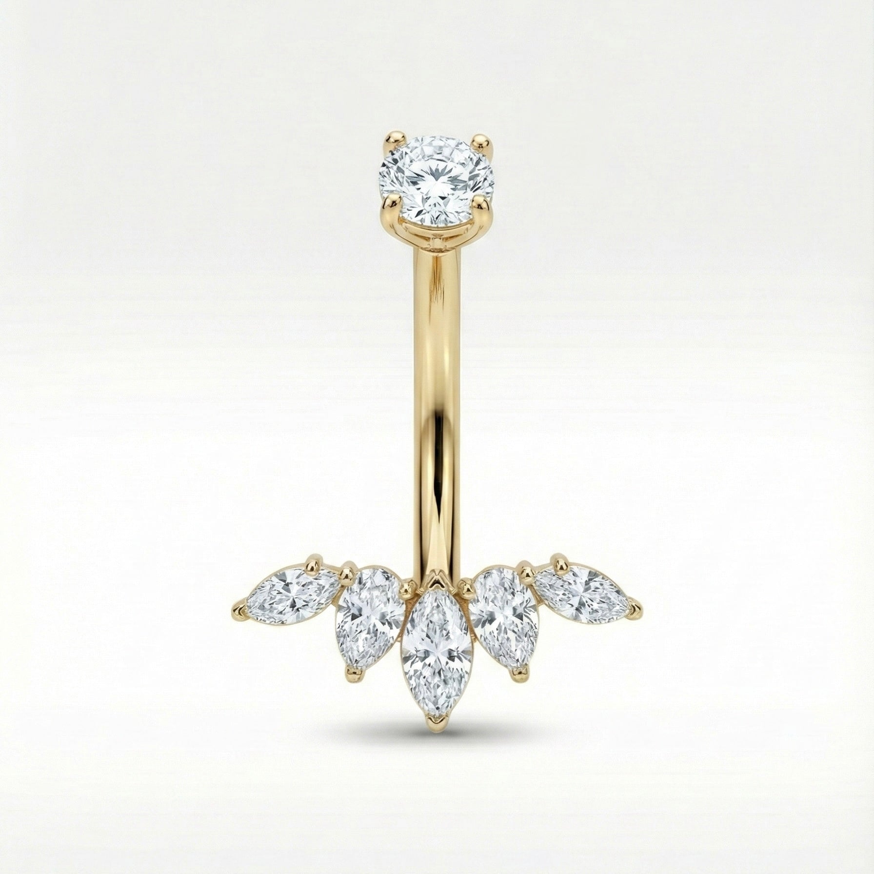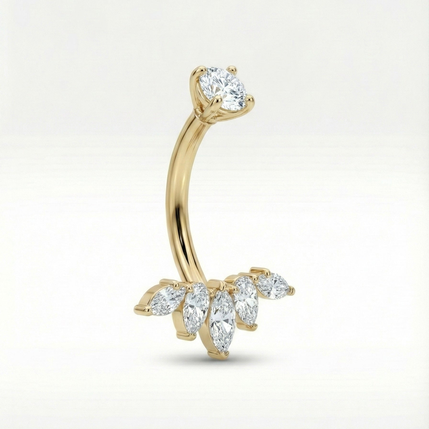 Ein Hauch von Luxus – dieses Bauchnabelpiercing aus TITAN (ASTM F136) vereint klassisch-runde Eleganz mit einem geschwungenen Tropfendesign aus fünf 5A Zirkonia. Die Tropfenform reflektiert das Licht wie Regentropfen – dezent, edel und feminin. Dank der hochwertigen Verarbeitung ist dieses Modell ein perfekter Eyecatcher für abgeheilte Piercings – auch im intimen Bereich (z. B. Christina-Piercing).