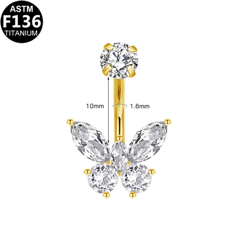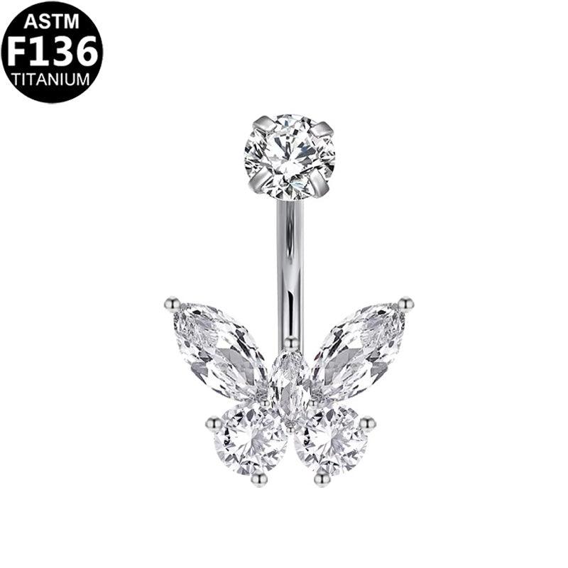 Ein zarter Blickfang: Dieses Bauchnabelpiercing aus TITAN (ASTM F136) präsentiert ein filigranes Schmetterlingsdesign aus facettierten Zirkonia. Die Flügel bestehen aus zwei tropfen- und zwei runden 5A Kristallen – kunstvoll gefasst und perfekt ausbalanciert. Ein feminines Schmuckstück für dein abgeheiltes Bauchnabel- oder Christina-Piercing, erhältlich in edlem Gold oder Silber.