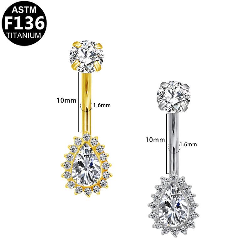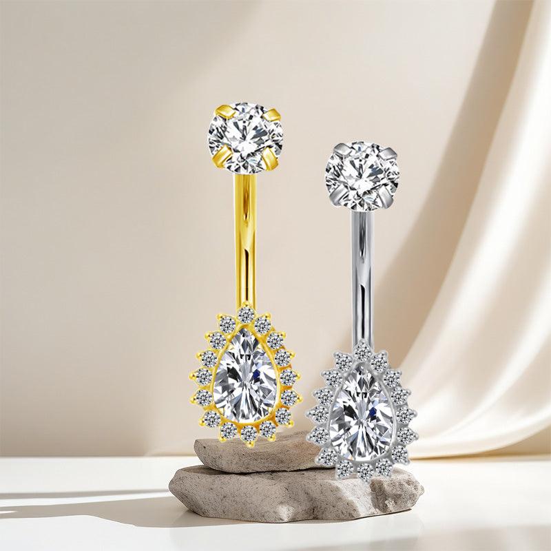 Klassik trifft Glamour: Dieses Bauchnabelpiercing aus TITAN (ASTM F136) setzt auf einen eleganten tropfenförmigen Zirkonia im Zentrum, umgeben von einem funkelnden Halo aus 5A Kristallen. Die Tropfenform sorgt für eine optische Verlängerung des Nabels – ideal für abgeheilte Bauchnabel- oder Christina-Piercings. Erhältlich in Gold oder Silber, mit hautfreundlichem Innengewinde.