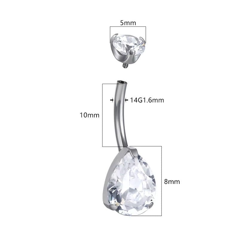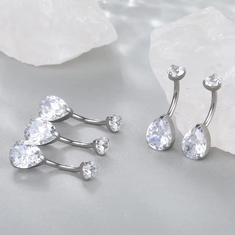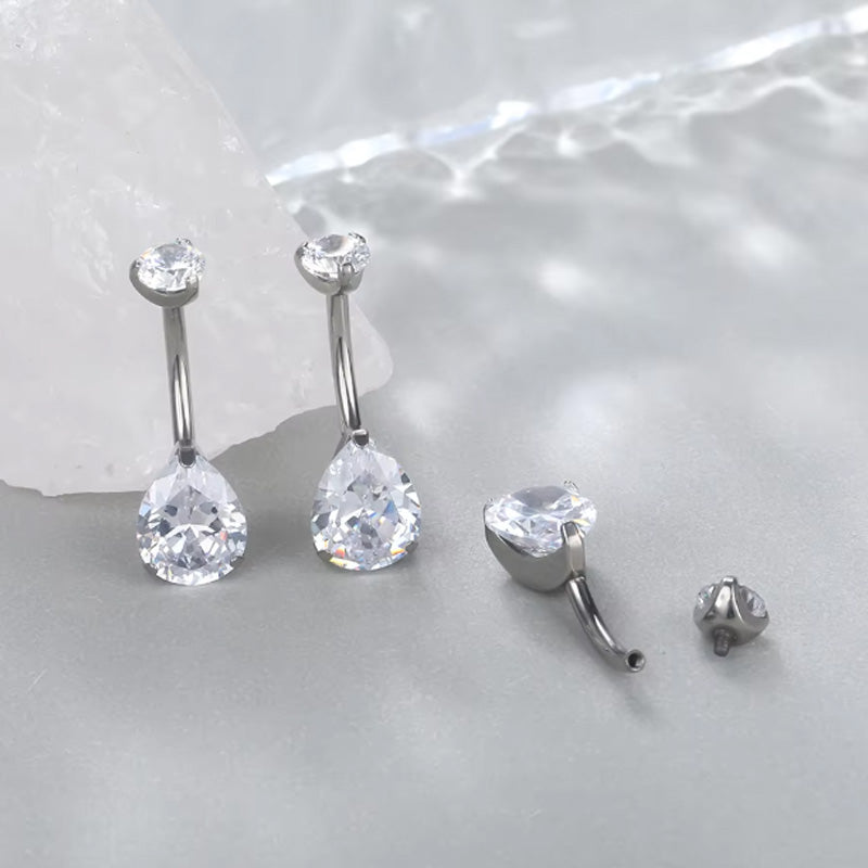 Schlankes Bananabell mit Tropfen-Zirkonia unten und rundem Top – beide sicher gefasst, Innengewinde für sanftes Einsetzen, wasserfest und kratzfest.