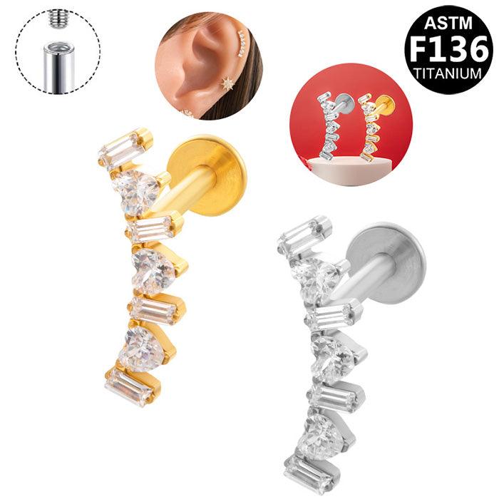 Organisch. Ausdrucksstark. Luxuriös. Dieses Labret aus TITAN (ASTM F136) setzt ein echtes Statement – mit einem sanft geschwungenen Verlauf aus präzise eingefassten 5A Zirkonia in runder und baguetteförmiger Schliffform. Das Ergebnis: pure Eleganz, perfekt für Helix- oder Conch-Piercings.