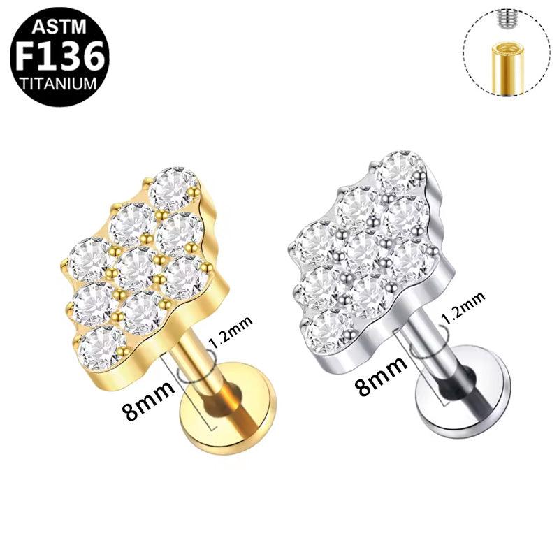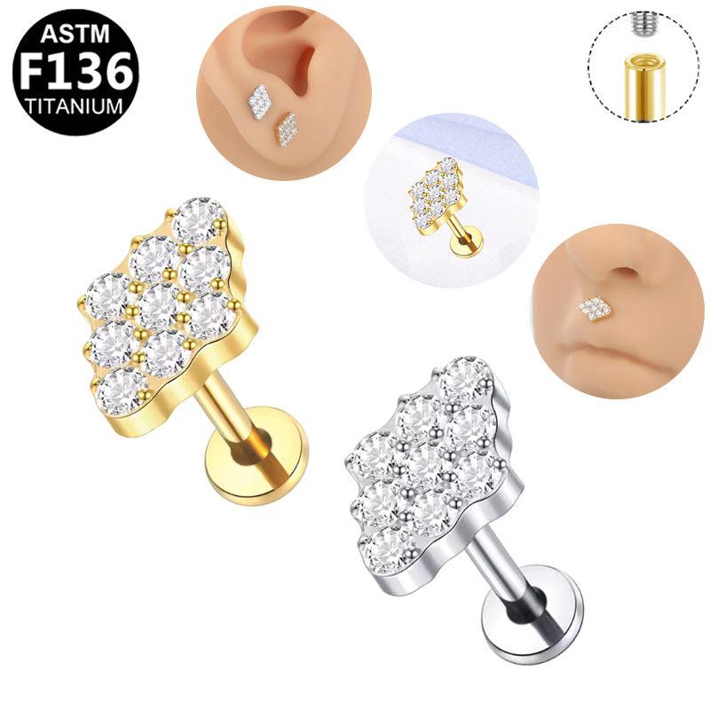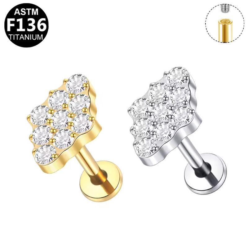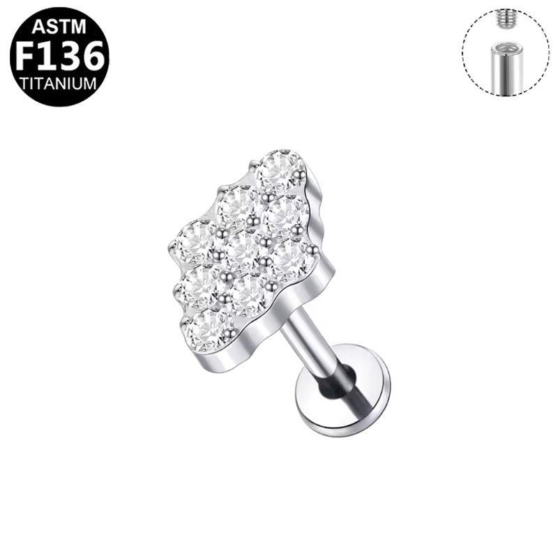 Mehr Glanz, weniger Lärm. Dieses Labret aus TITAN (ASTM F136) bringt mit seiner fein gearbeiteten Kristallfläche aus neun eingefassten Zirkonia puren Luxus an dein Piercing. Dezent in der Form, stark in der Wirkung – für dein Helix-, Tragus-, Conch- oder Flat-Piercing.