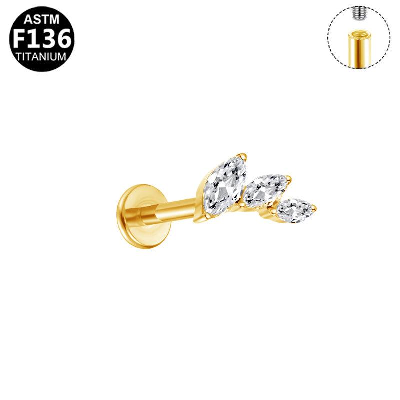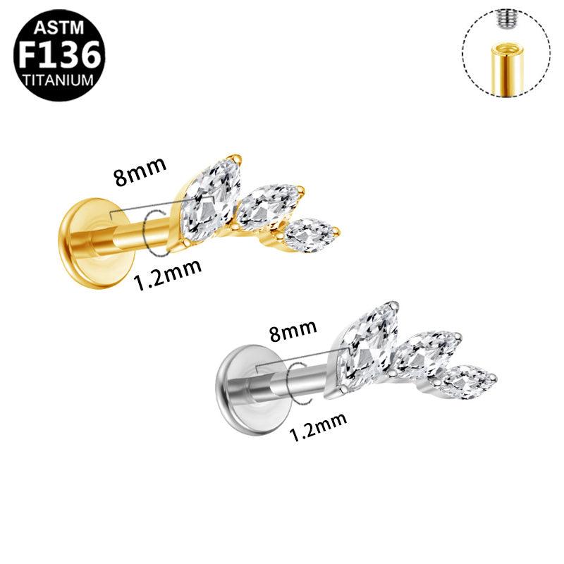 Modern, elegant und raffiniert. Dieses Labret aus TITAN (ASTM F136) kombiniert drei Zirkonia-Kristalle im Marquiseschliff zu einem dynamischen Design mit sanftem Schwung. Die asymmetrische Anordnung wirkt besonders stilvoll und verleiht deinem Helix-, Tragus- oder Flat-Piercing einen edlen Akzent.