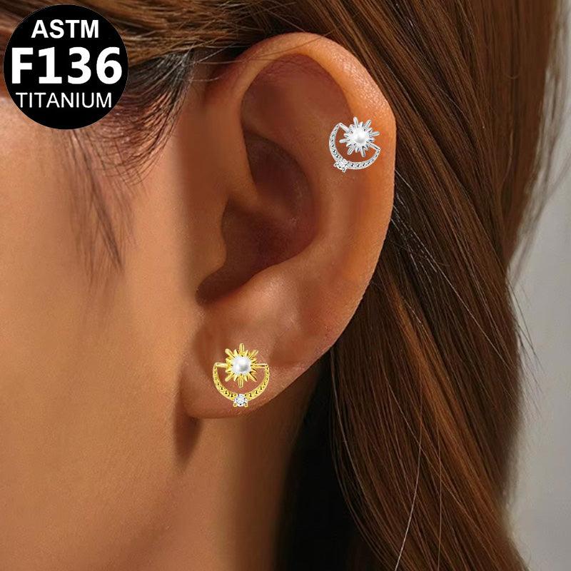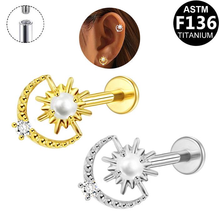 Inspiriert von kosmischer Symbolik – dieses Labret aus TITAN (ASTM F136) kombiniert eine filigrane Mond-Sichel mit Kugelstruktur, einen zentralen und einen funkelnden 5A Zirkonia. Das Resultat: ein harmonisches Zusammenspiel von Licht & Dunkelheit – ideal für dein Helix-, Flat- oder Lobe-Piercing.