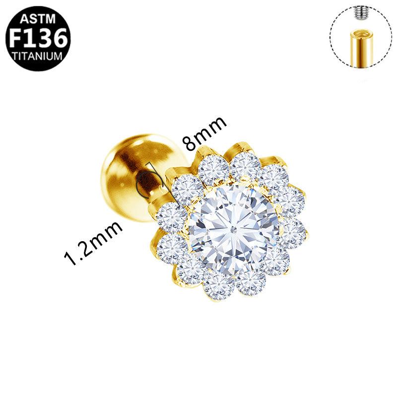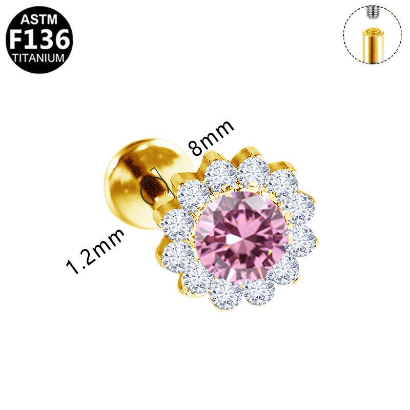 Ein funkelndes Highlight in Blütenform: Dieses Labret aus TITAN (ASTM F136) kombiniert einen farbigen Mittelstein mit einem glitzernden Kranz aus hochwertigen 5A Zirkonia. Das Design erinnert an eine florale Halo-Fassung und bringt Eleganz in jedes Ohrpiercing. Wahlweise in Gold oder Silber – mit Innengewinde für sicheren, komfortablen Halt.