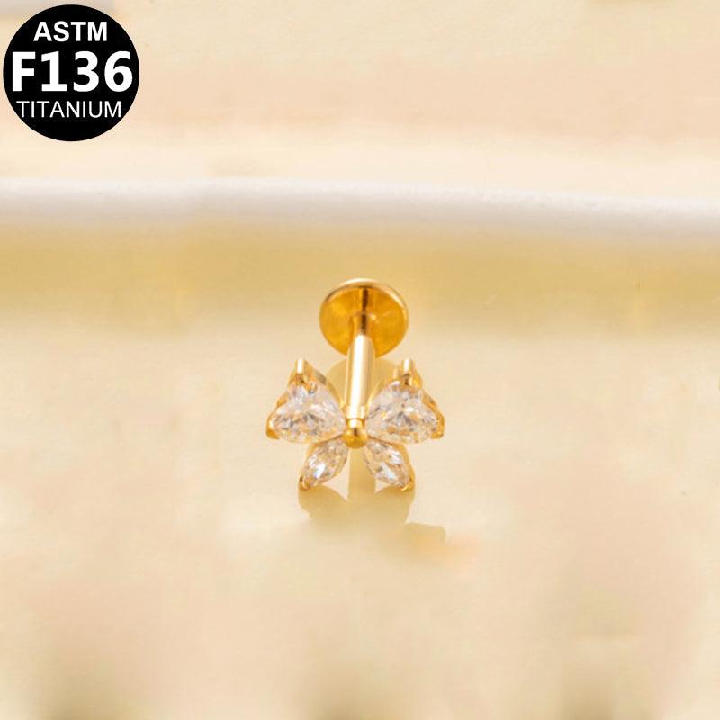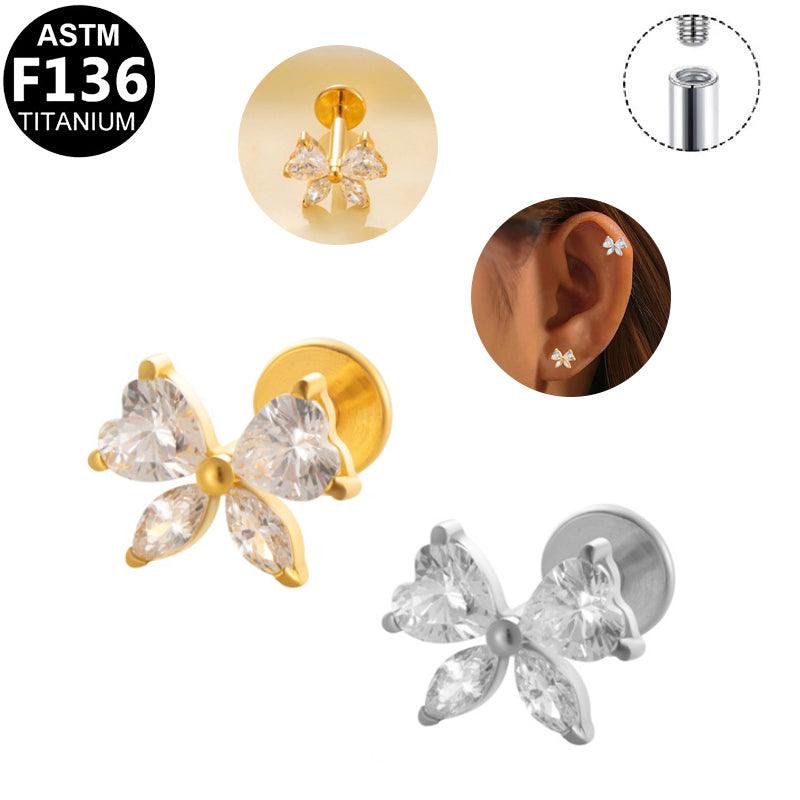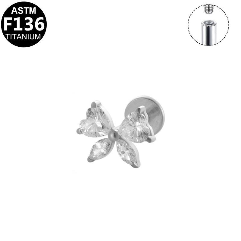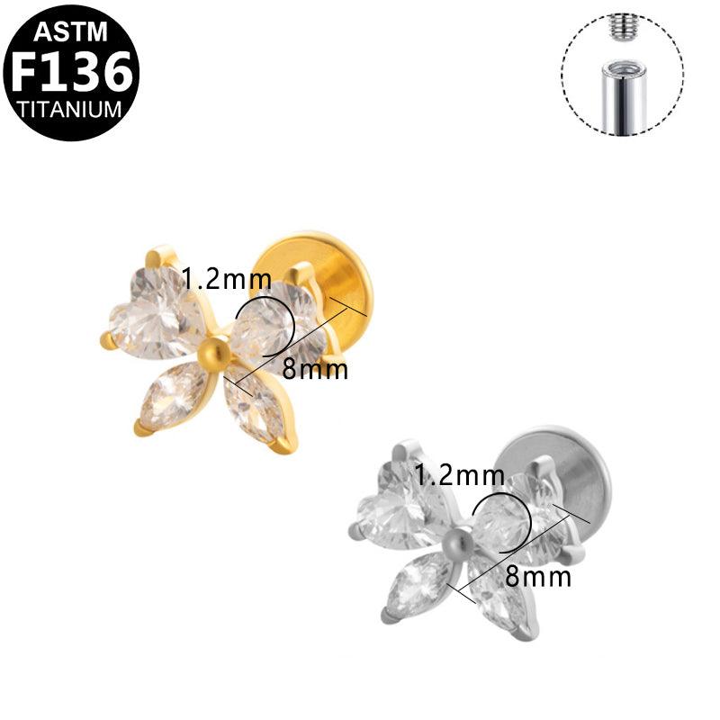 Leicht wie ein Flügelschlag, stark wie Titan. Dieses filigrane Labret aus TITAN (ASTM F136) bringt einen stilvollen Schmetterling aus vier gefassten 5A Zirkonia in Herz- und Marquiseform an dein Piercing. Ob in Gold oder Silber – dieses Schmuckstück verleiht deinem Look eine subtile Eleganz mit funkelndem Finish.