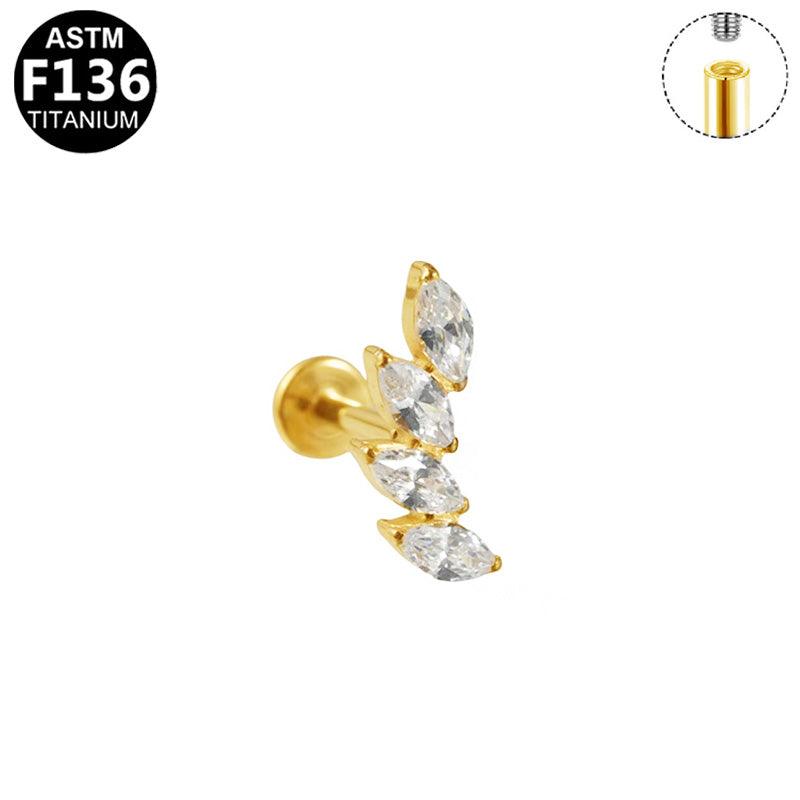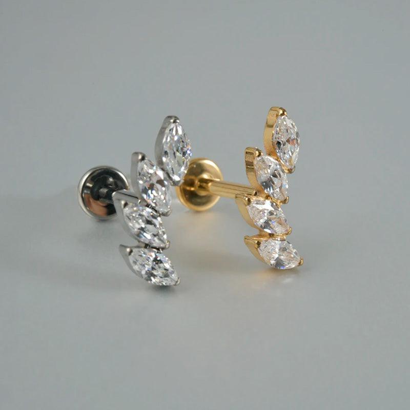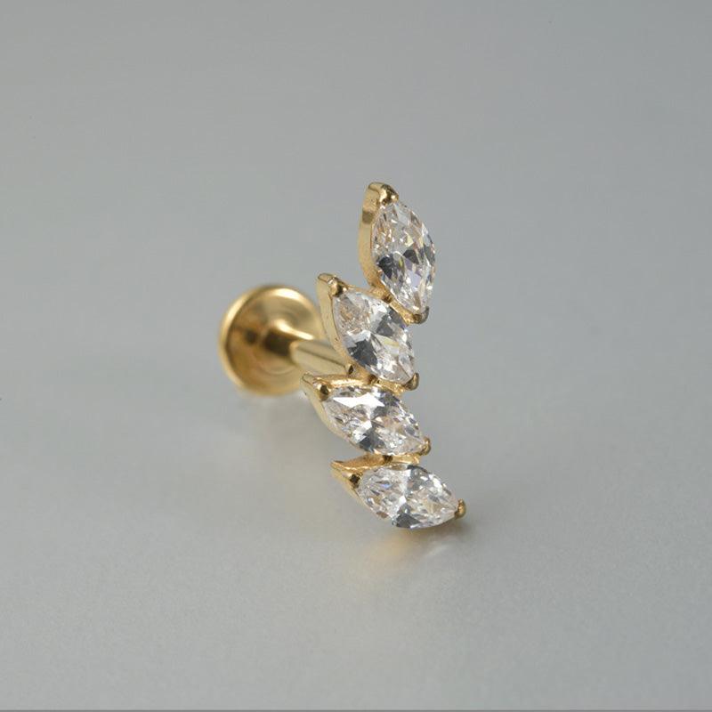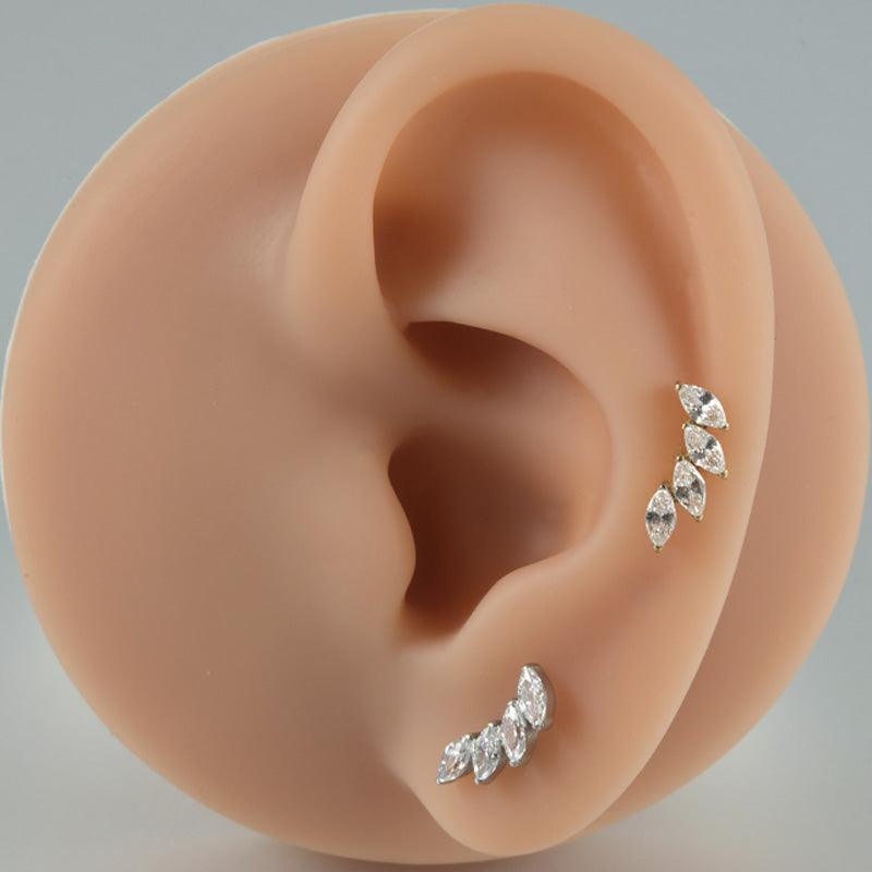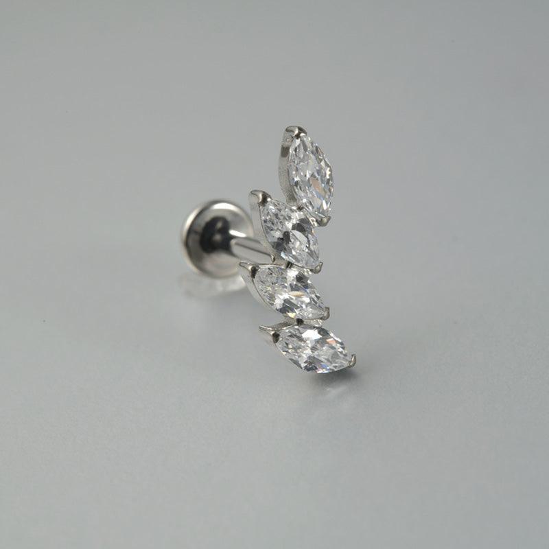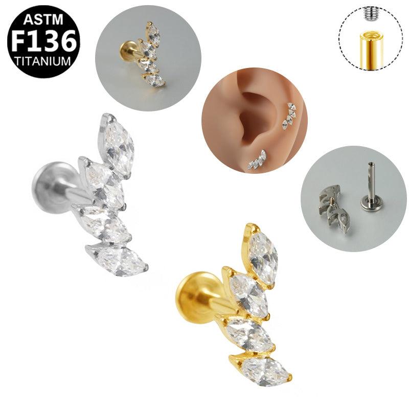 Für alle, die es funkeln lassen wollen – dieses Labret aus TITAN (ASTM F136) trägt fünf Zirkonia-Kristalle im edlen Marquiseschliff, versetzt angeordnet in einer sanft geschwungenen Linie. Die Anordnung erzeugt eine fließende Dynamik und macht dieses Stück perfekt für dein Helix-, Tragus-, Conch- oder Flat-Piercing.