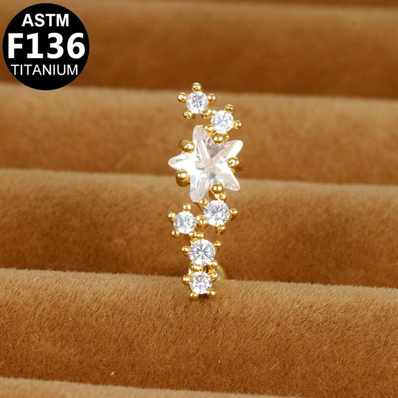 Ein himmlisches Highlight: Dieses Labret aus TITAN (ASTM F136) kombiniert einen facettierten Stern-Zirkonia mit sechs runden 5A-Kristallen zu einem eleganten vertikalen Design. Perfekt für deinen Helix-, Flat- oder Lobe-Piercing – wahlweise in vergoldet oder silberfarben. Mit Innengewinde für komfortablen und sicheren Halt.